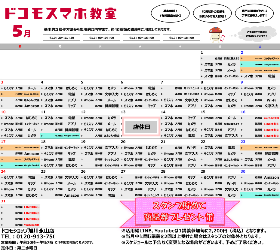 2026.04.25 Information dnaga 5月のdocomoスマホ教室のご案内 旭川永山店では毎月「ドコモスマホ教室」を開催しております! ・スマホが欲しいけど使えるか不安… ・スマホを買ったけど使い方がわからない ・もっと使いこなしたい など ご予約やご不明な点は、お気軽にお電話ください! ご参加、お待ちしております♪ ※クリックすると拡大します。 Tweet Share +1